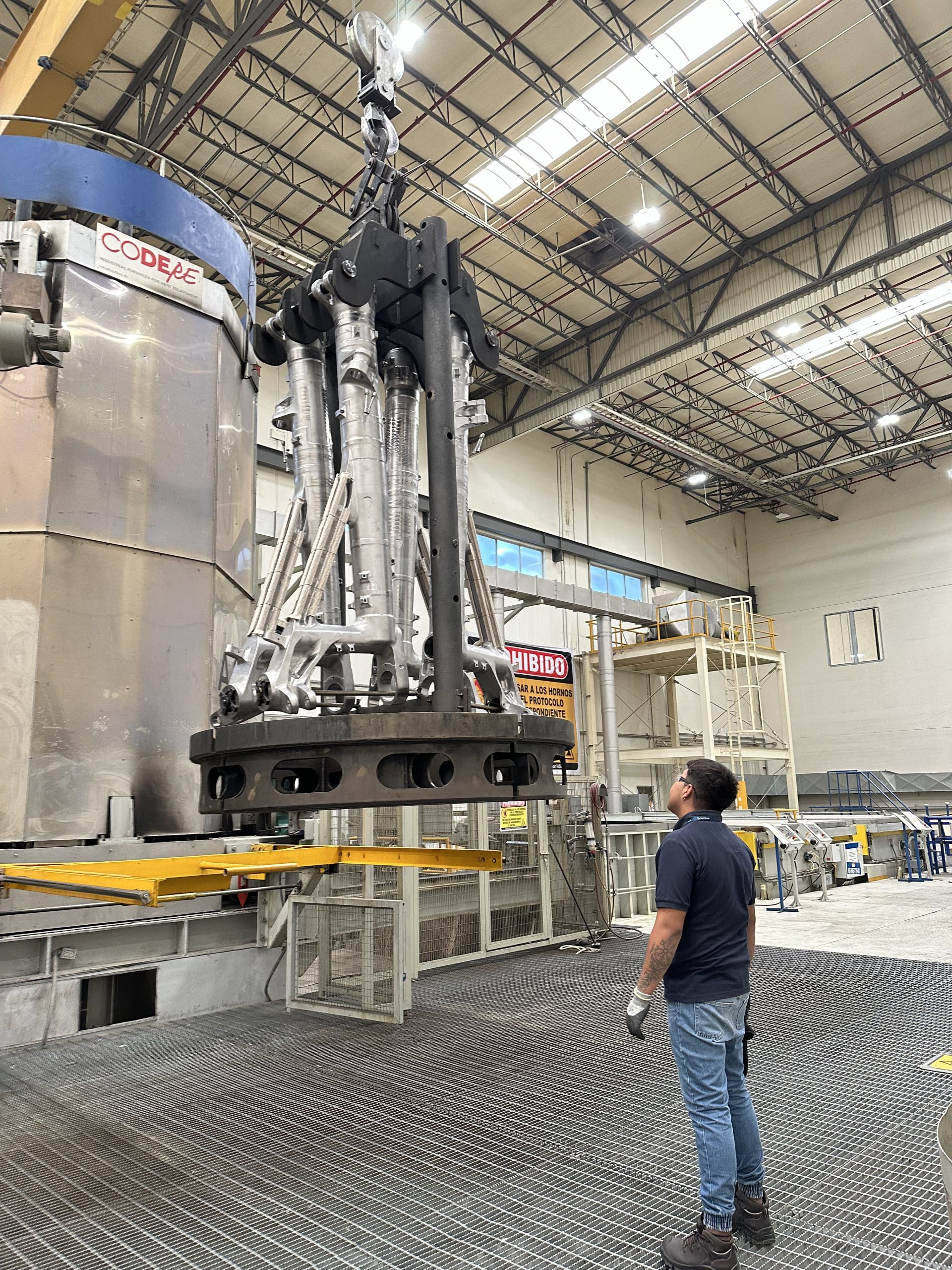 For instance this photo from a “Safran” facility in Mexico shows a gantry style furnace provided by a Swiss furnace builder by the name of “Codere”.