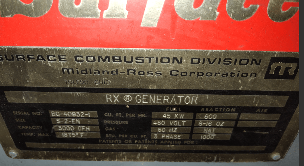 Manufactured by “Surface Combustion” of Maumee, Ohio this is a Model S-2-EN Endothermic generator, Serial Number BC-40932-1.