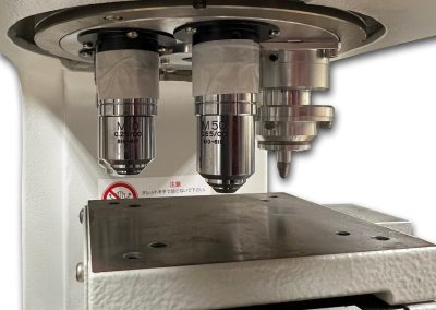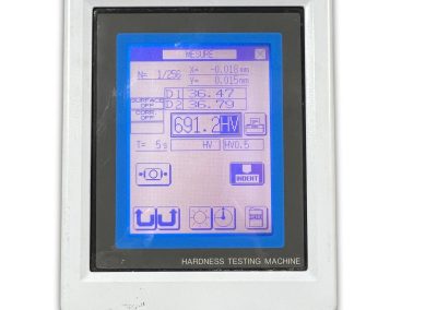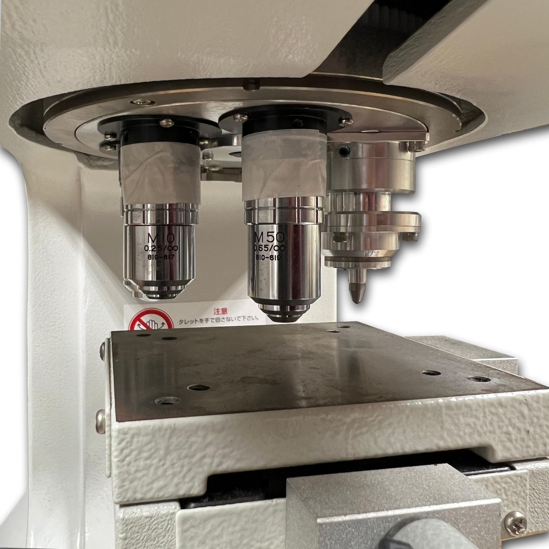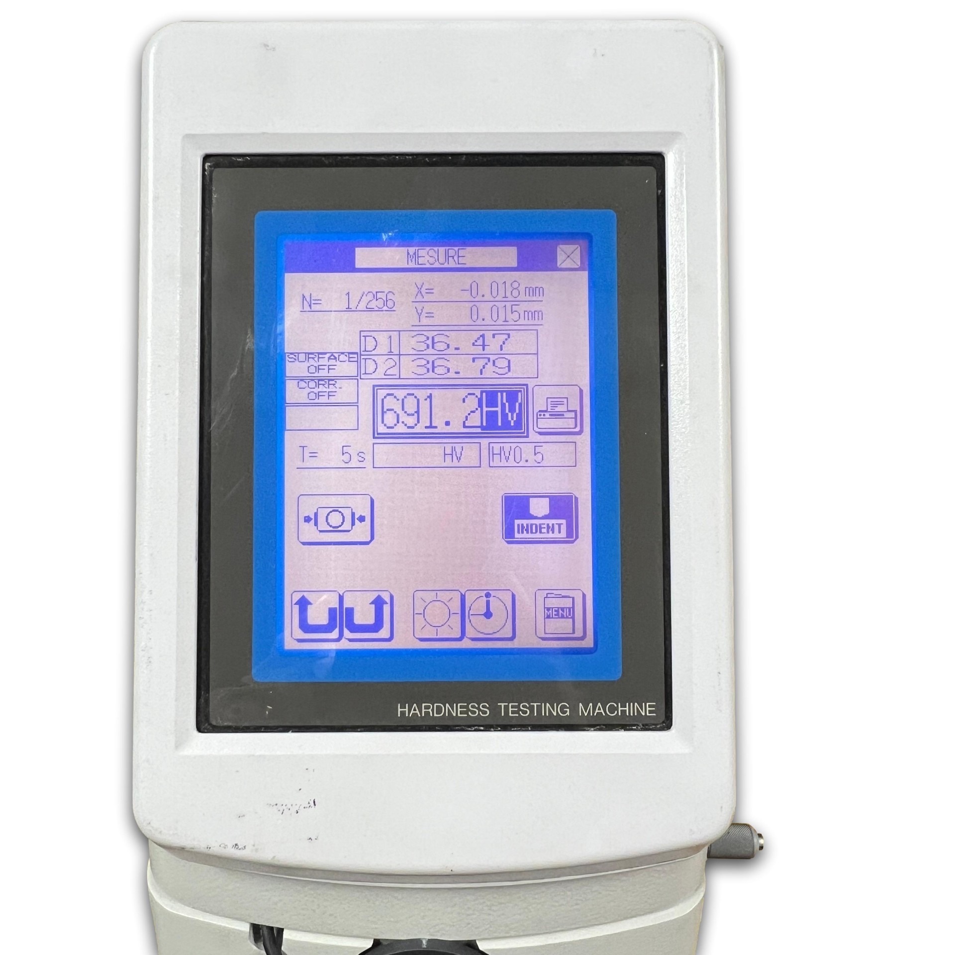 Comes with 10x, 50x & 100x Mitutoyo objectives, and a certified Vickers indenter mounted on a motorized turret. Large Easy-To-Use Screen console (touchscreen) for Tester Control and Hardness Readout. Precision Digital Filar with 0.01 Resolution readout. Powerful Halogen Illuminator with adjustable Aperture Diaphragm and Removable Green filter. Twin Mitutoyo digital X/Y stage micrometers, with digital readout of X/Y stage movement and data output from serial and Centronics ports.