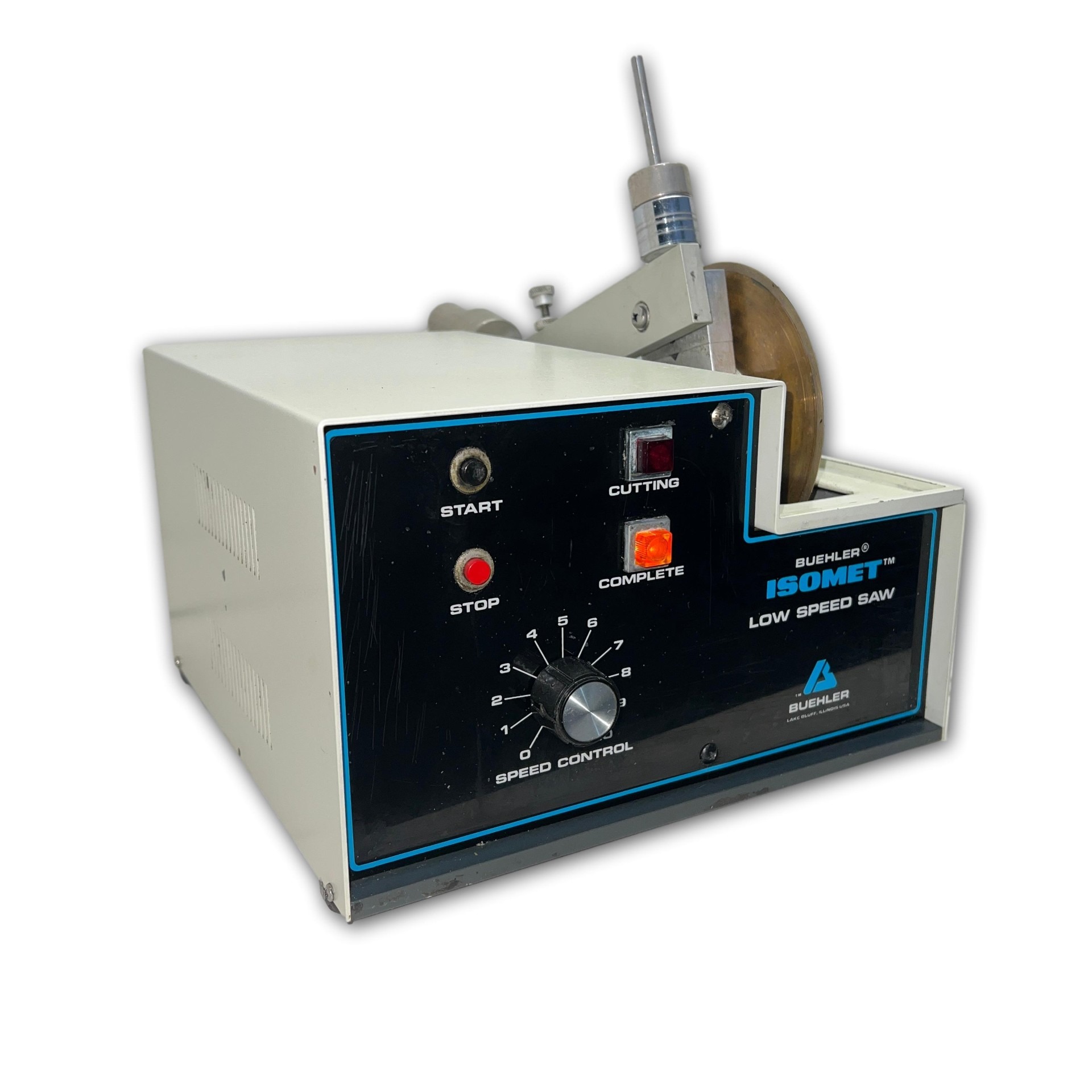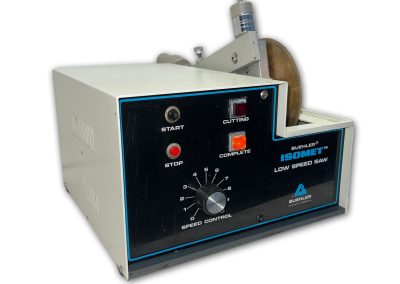 Good condition Buehler IsoMet Low Speed cutting machine, with variable speed 0-300RPM. With diamond blade (included), this saw is capable of cutting virtually any material including brittle or ductile metals, composites, cements, laminates, plastics, electronic devices and biomaterials.