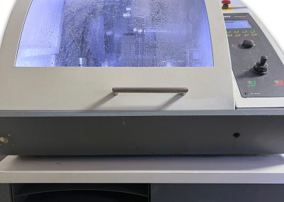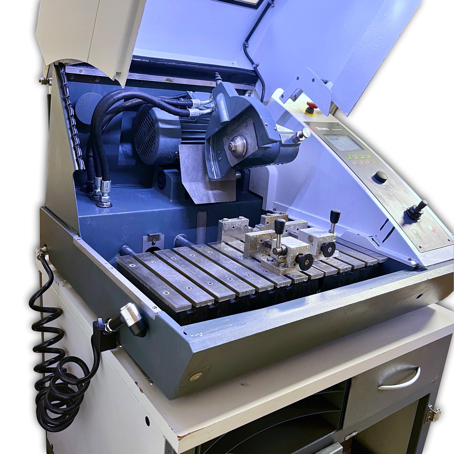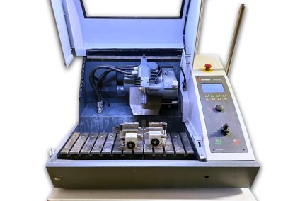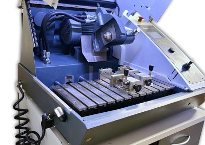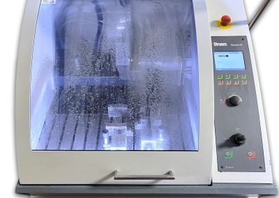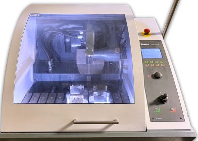 The Discotom-10 accepts up to 10″ blade size (abrasive or diamond) and has a large T-slotted table with automatic Y-Axis movement to section large workpieces automatically. It also has a large cutting arm for manual cutting.