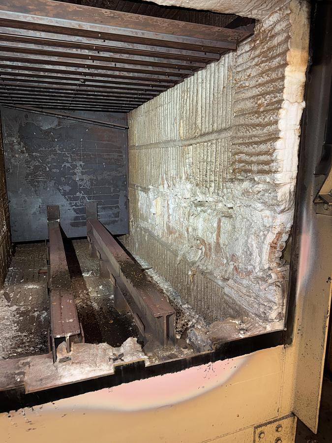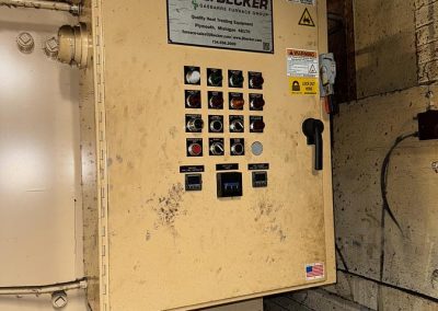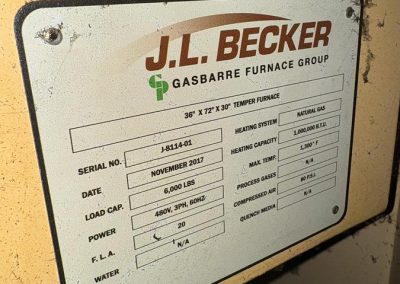 Fiber Lined Recirculating Box Tempering Furnace complete with Top-Mounted Alloy Recirculating Fan, Adjustable Roof Air Louvers, Eclipse AH Package Burner System w/Flame Safety, Alloy Flat Rail Hearth, and Vertical Rising Pneumatic Front Door. Side-Mounted Control Panel with Motor Starters etc. Eurotherm Digital Temperature Control and Partlow Digital High Limit.